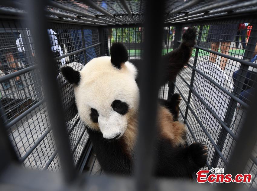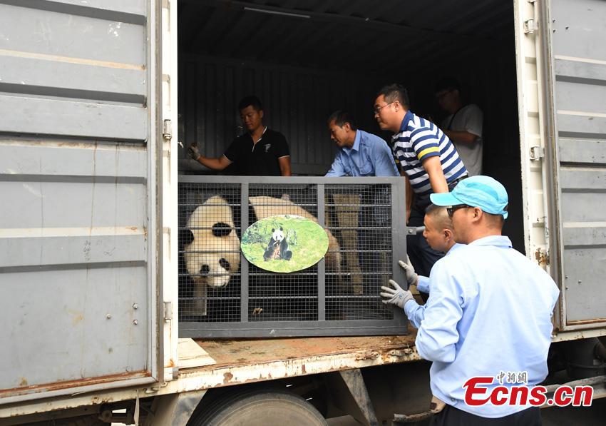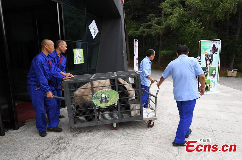 One of two giant pandas given new homes in Jilin Province is transported to Changchun Airport in Jilin Province, Aug. 20, 2018. Jiajia and Mengmeng were the first giant pandas to live in a high-altitude habitat in China after they were moved from Sichuan to the Jilin Wild Life Rescue and Breeding Center in Changchun in 2015. Over the past three years, the two pandas have adapted to the new environment in Changchun. They have now been transported to Dujiangyan base in Sichuan province for a breeding project next year. (Photo: China News Service/Zhang Yao)