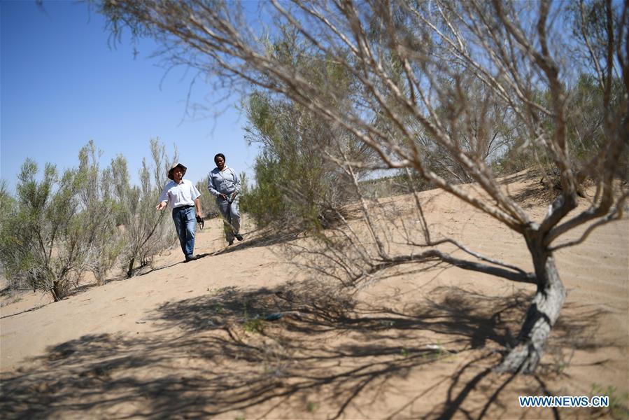Nakanyala Elina Shekupe (R) and a staff member of Gansu Desert Control Research Institute visit a desertification combating demonstration zone in northwest China's Gansu Province, Aug. 25, 2018. Shekupe, 37, is an agricultural technology official from Namibia. She and 11 other students are taking part in a desertification combating and ecological restoration training course organized by China's Ministry of Commerce in Gansu. "I hope more and more African friends will come to China to learn new technology on desert control and benefit people in their hometown, " she said. (Xinhua/Chen Bin)