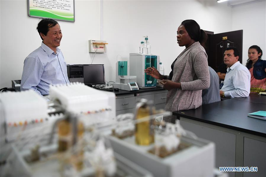 Nakanyala Elina Shekupe (2nd L) learns technology on desertification combating at a lab in northwest China's Gansu Province, Aug. 27, 2018. Shekupe, 37, is an agricultural technology official from Namibia. She and 11 other students are taking part in a desertification combating and ecological restoration training course organized by China's Ministry of Commerce in Gansu. "I hope more and more African friends will come to China to learn new technology on desert control and benefit people in their hometown, " she said. (Xinhua/Chen Bin)