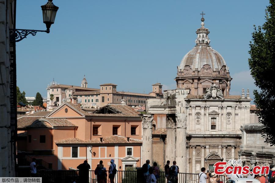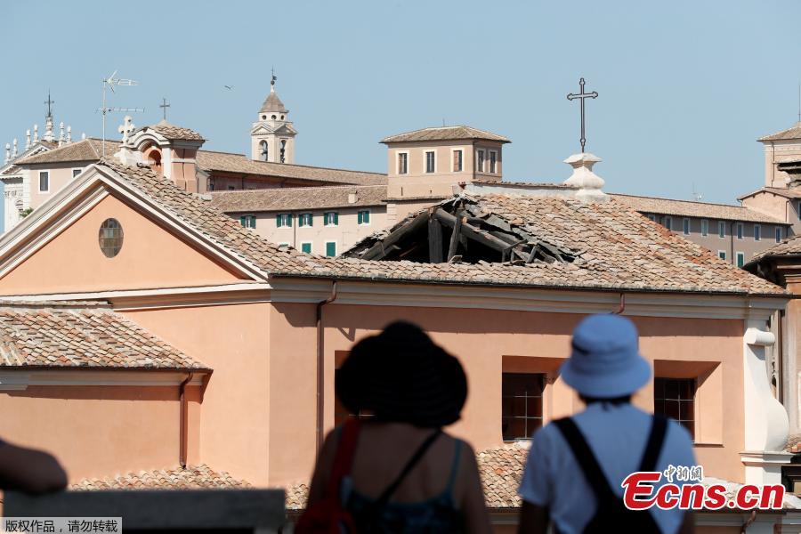 People look at the collapsed roof of the San Giuseppe dei Falegnami church in Rome, Italy, Aug. 30, 2018. The church was closed to the public at the time and is normally open only for marriage ceremonies, but dogs were brought in to sniff through the rubble to make certain no one had been buried, the fire department said. (Photo/Agencies)