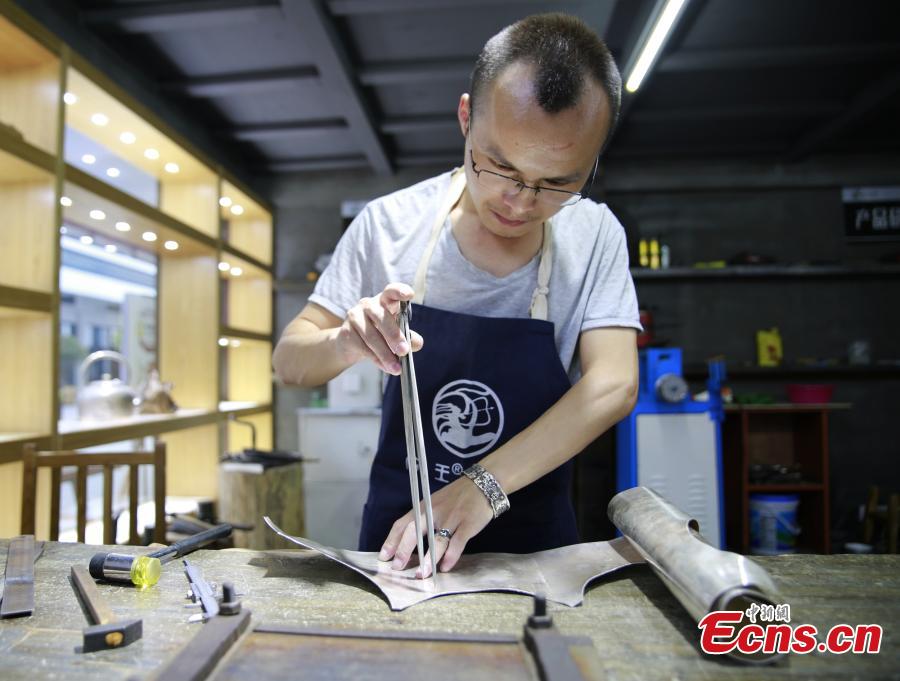 Yang Changgan makes a silver pot in his studio in Zhangjiajie City, Central China’s Hunan Province, Sept. 5, 2018. Yang, born in 1986 in Guizhou Province, was exposed to the craft of silverwork from an early age. After completing his bachelor’s degree at Nanchang Institute of Technology in 2010, he learned with Yang Guangbin, a master crafter of the silver ornaments of the Miao people. He then opened his own studio in Zhangjiajie in 2015, mainly developing silver pot products. Yang said it takes 10-15 days to make a silver pot as the process involves nearly 100 steps, including pounding, refining and wielding. Yang said his creations sell well in nearly 20 countries and regions. (Photo: China News Service/Wu Yongbing)