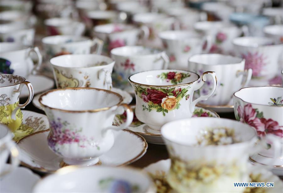 English teacups and saucers of teacup collector June Gao are seen in Vancouver, Canada, Sept. 13, 2018. (Xinhua/Liang Sen)