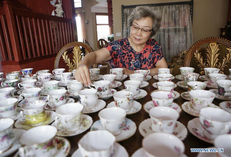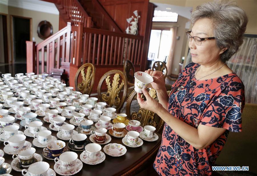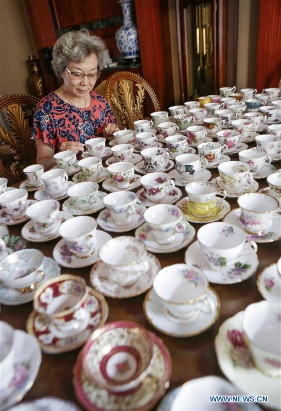 Teacup collector June Gao displays one of her teacup collections at her house in Vancouver, Canada, Sept. 13, 2018. (Xinhua/Liang Sen)