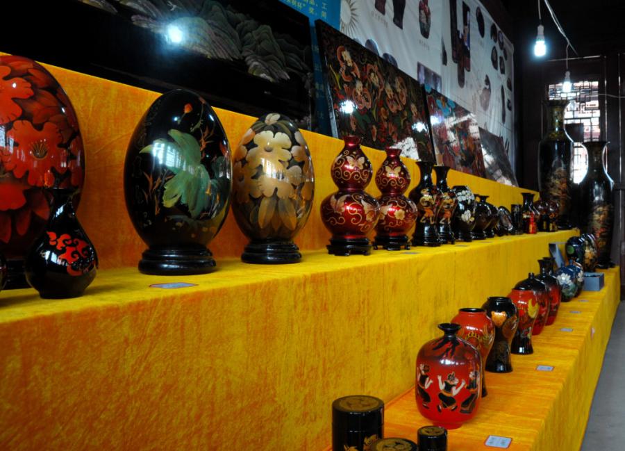 Lacquerware made in Dafang county, Guizhou Province has been known for its beauty. They are often moulded on a base of horse or buffalo skin, shaped after dipping in water, then dried over fire. This art form has been existed for over 600 years. (Photo/China Daily)