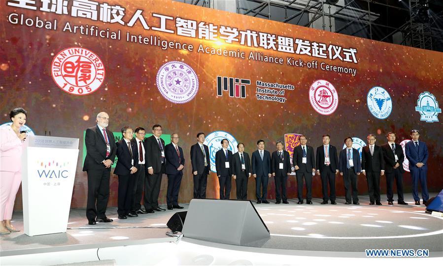 Guests attend a global artificial intelligence academic alliance kick-off ceremony during the World Artificial Intelligence Conference (WAIC) 2018 in Shanghai, east China, Sept. 17, 2018. The three-day conference has attracted experts, scholars and entrepreneurs from nearly 40 countries and regions. More than 200 leading companies in AI participated in the conference and the exhibition. (Xinhua/Fang Zhe)