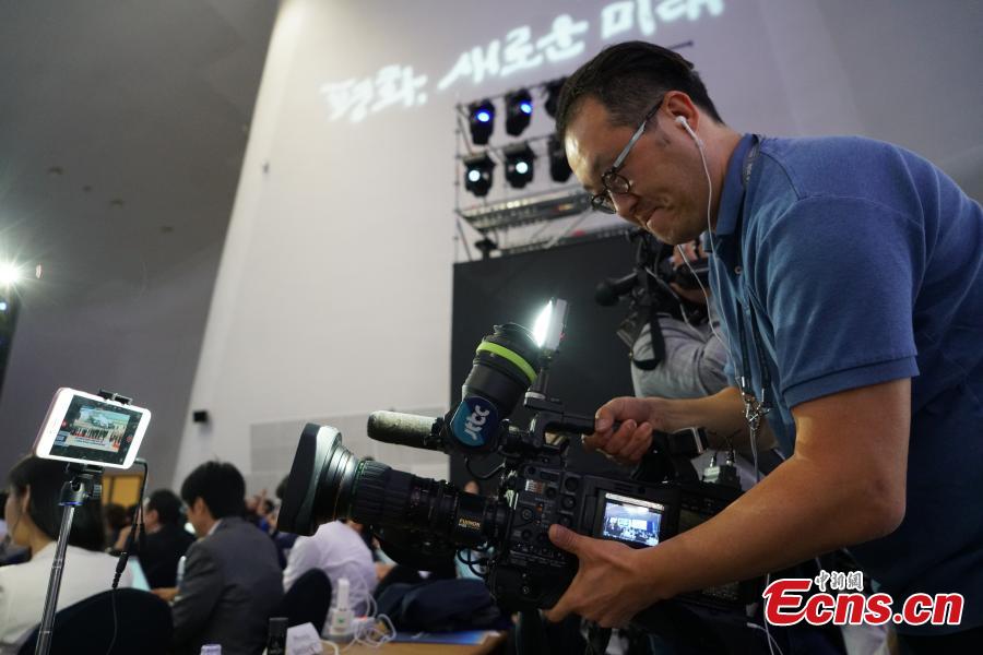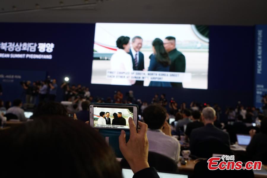 People watch the televised broadcast in Seoul, South Korea, Sept. 18, 2018, of South Korea's President Moon Jae-in as he is greeted by the Democratic People's Republic of Korea leader Kim Jong Un after arriving in Pyongyang for the inter-Korean summit. (Photo: China News Service/Zeng Ding)