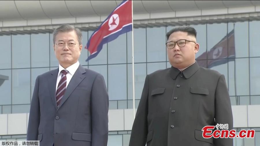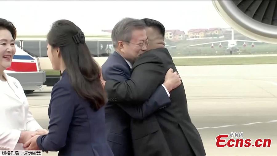 In this image made from video, South Korean President Moon Jae-in, right, is welcomed by the Democratic People's Republic of Korea leader Kim Jong Un for a photo on the podium upon arrival in Pyongyang, Sept. 18, 2018. Moon landed in Pyongyang for his third summit this year with Kim. (Photo/Agencies)
