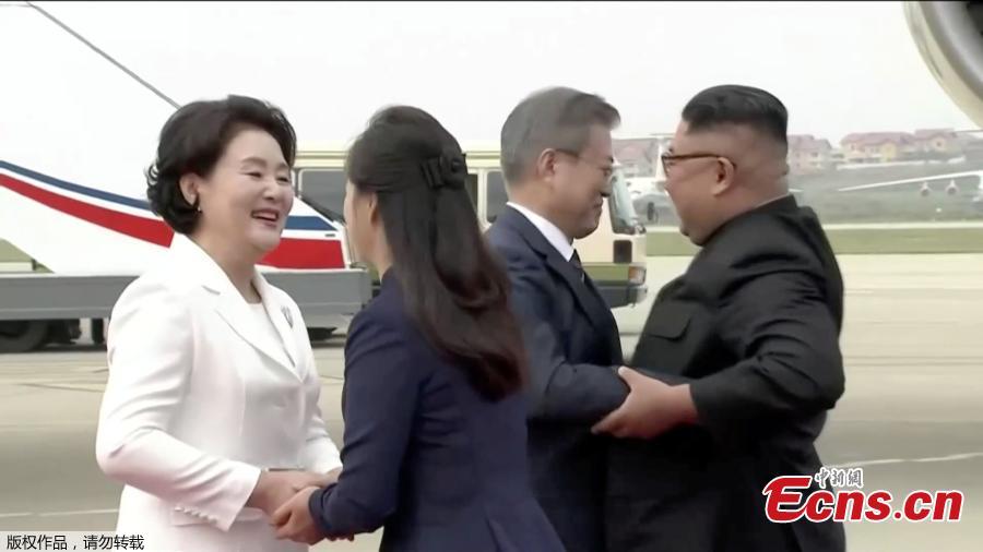 In this image made from video, South Korean President Moon Jae-in, second from right, and his wife Kim Jung-sook, left, are welcomed by the Democratic People's Republic of Korea leader Kim Jong Un and his wife Ri Sol Ju upon their arrival in Pyongyang, DPRK, Sept. 18, 2018. Moon landed in Pyongyang for his third summit this year with Kim. (Photo/Agencies)