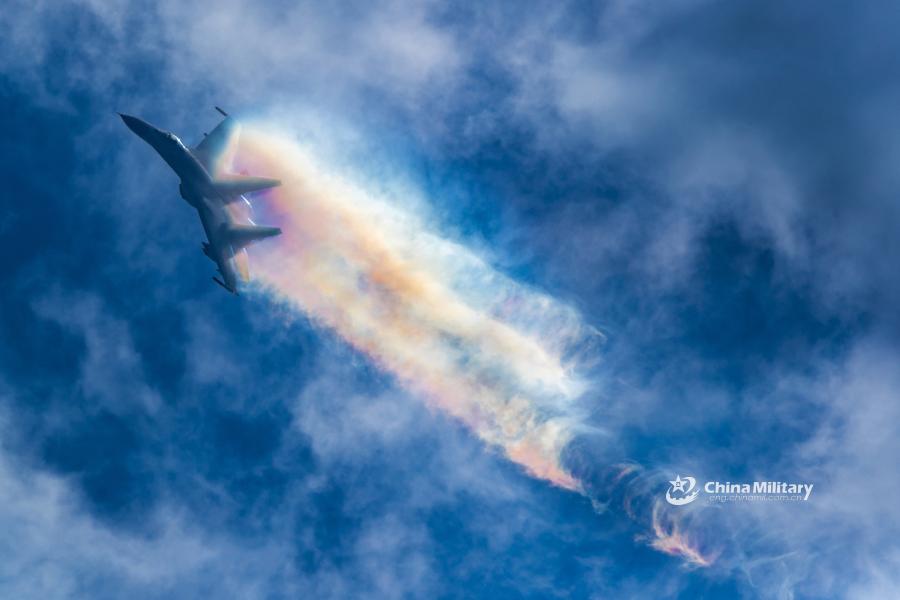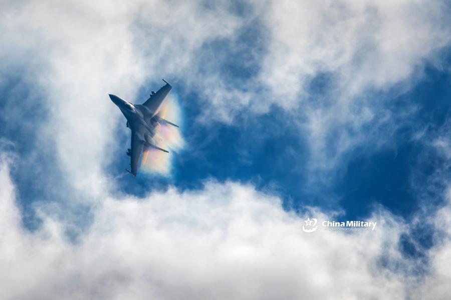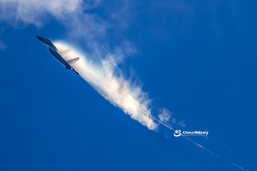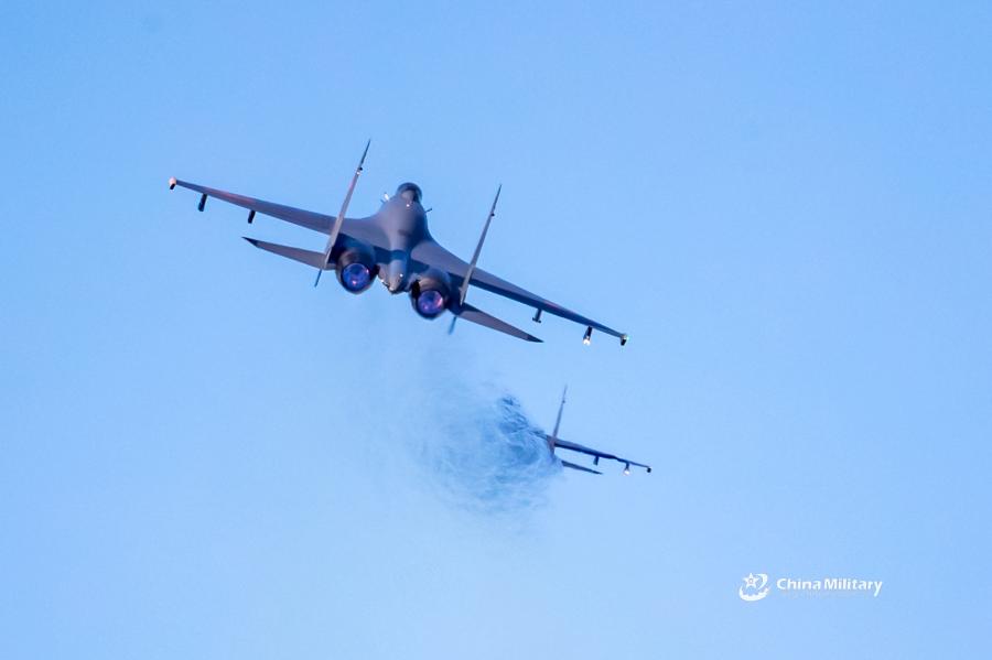 A J-11B fighter jet attached to an aviation brigade of the air force with the PLA Northern Theater Command performs the stiff pitch during a recent round-the-clock flight training exercise. (Photo/eng.chinamil.com.cn)