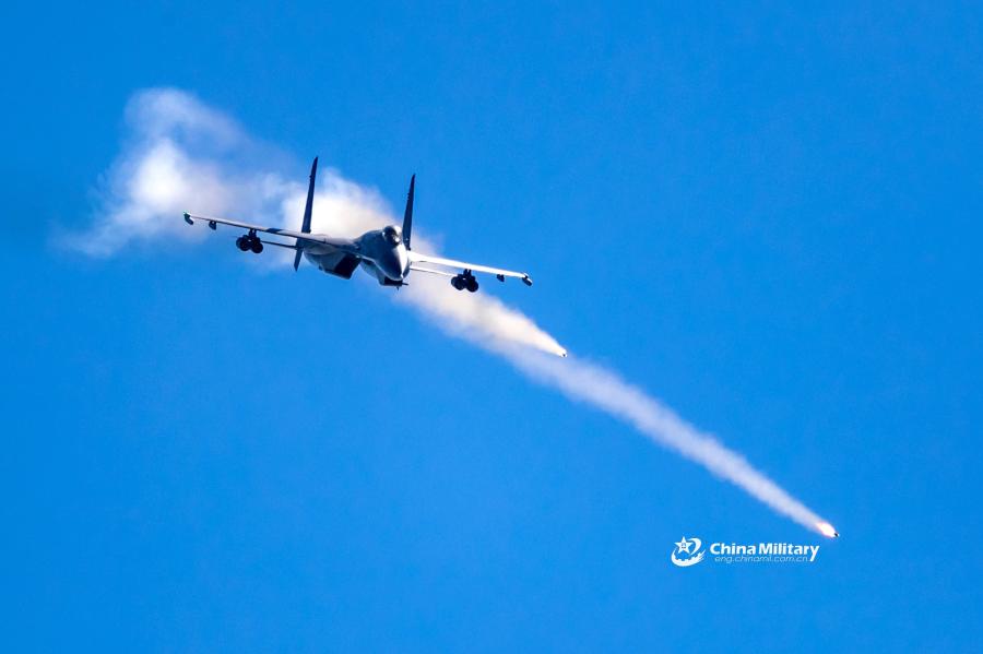 A J-11B fighter jet attached to an aviation brigade of the air force with the PLA Northern Theater Command shoots a flare off during a recent round-the-clock flight training exercise. (Photo/eng.chinamil.com.cn)