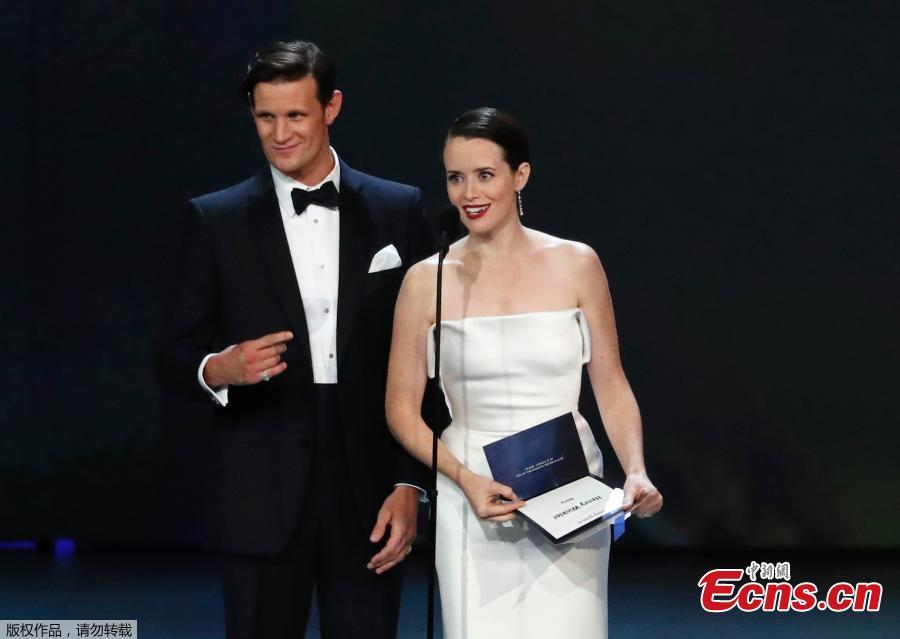 Matt Smith, left, and Claire Foy present the award for outstanding supporting actor in a comedy series at the 70th Primetime Emmy Awards, Sept. 17, 2018, at the Microsoft Theater in Los Angeles. (Photo/Agencies)