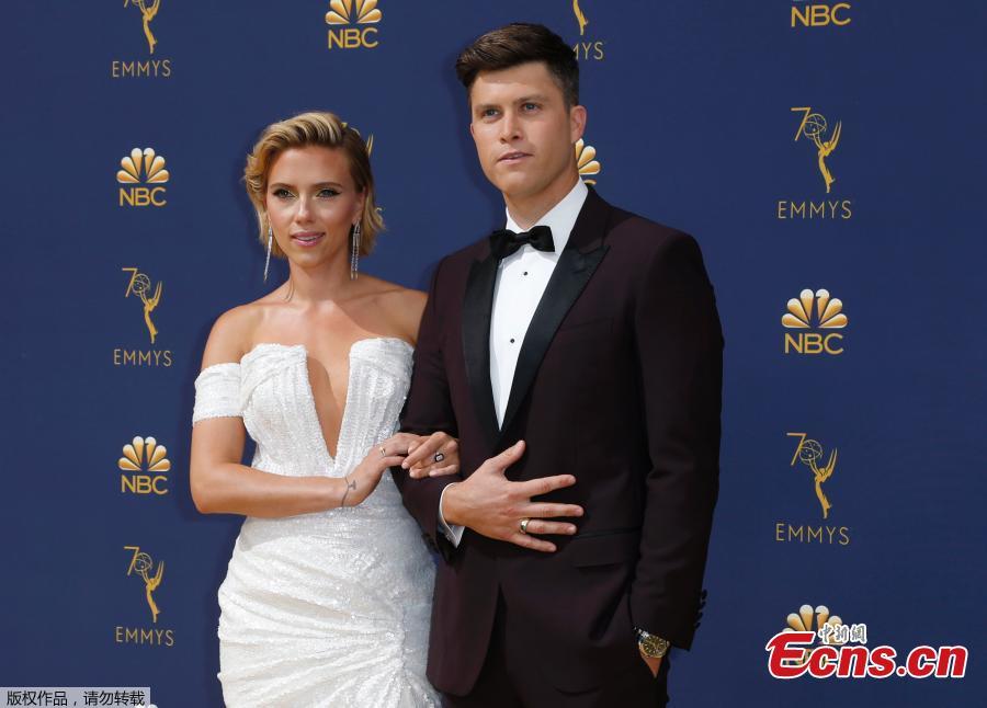 Scarlett Johansson, left, and Colin Jost arrive at the 70th Primetime Emmy Awards, Sept. 17, 2018, at the Microsoft Theater in Los Angeles. (Photo/Agencies)