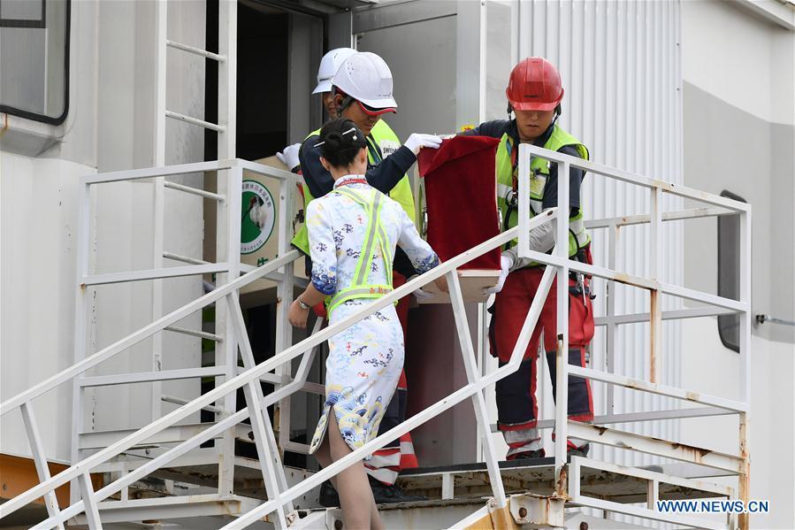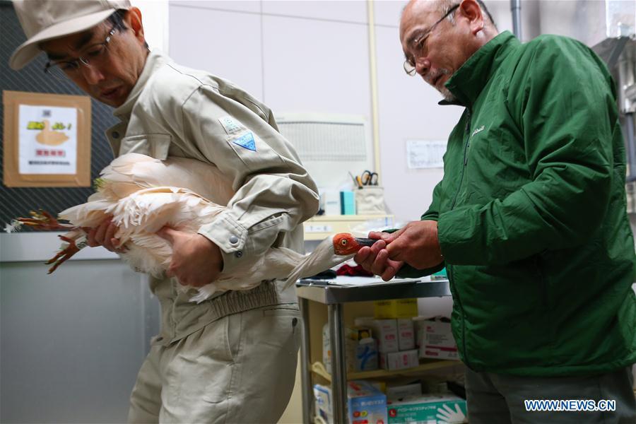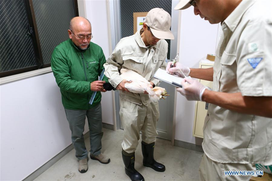 A crested ibis from China receives physical examination at the Sado Japanese Crested Ibis Conservation Center in Niigata Prefecture, Japan, Oct. 17, 2018. A pair of crested ibises from China arrived in Japan on Wednesday as a symbol of friendship between the two countries. (Xinhua/Ma Caoran)