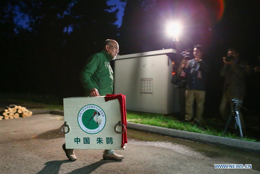 A pair of crested ibises from China arrive at Japan's Narita Airport, Oct. 17, 2018. A pair of crested ibises from China arrived in Japan on Wednesday as a symbol of friendship between the two countries. (Xinhua/Hua Yi)