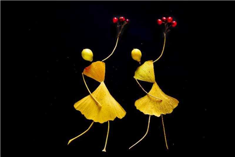 When winter approaches, leaves fall, and those leaves can be used, with some fruits and flowers, to create pictures of dancers.