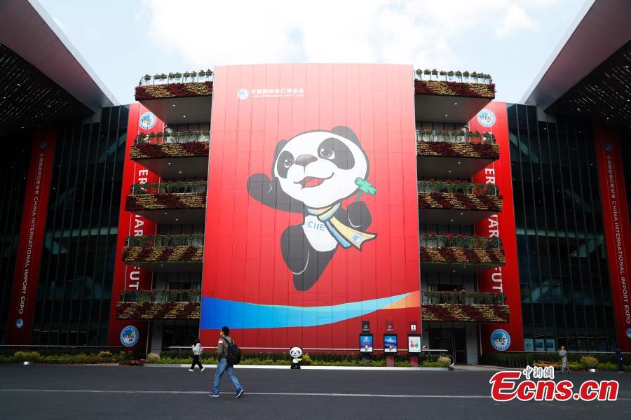 Jinbao, the mascot for the first China International Import Expo (CIIE) is seen marked on a wall of the National Exhibition and Convention Center (Shanghai), the main venue to hold the upcoming first China International Import Expo (CIIE). (Photo: China News Service/Tang Yanjun)