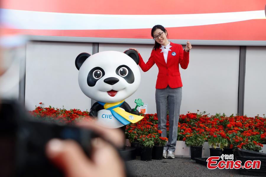 A volunteer for the upcoming China International Import Expo (CIIE) poses for a photo with the mascot "Jinbao" outside the National Exhibition and Convention Center in Shanghai, East China, on November 1, 2018. (Photo: China News Service/Tang Yanjun)