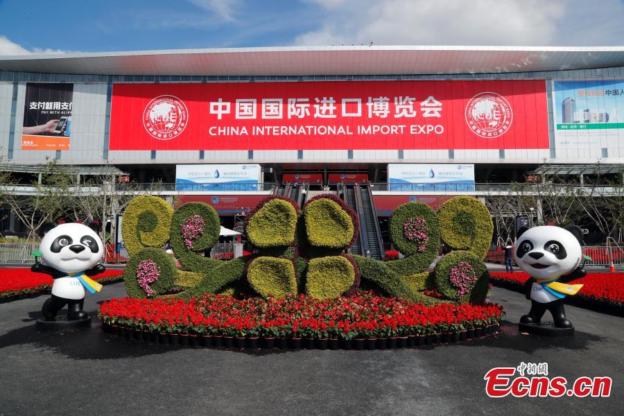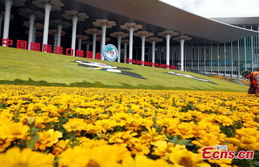 Flower parterre is arranged in front of the National Exhibition and Convention Center. (Photo: China News Service/Tang Yanjun)