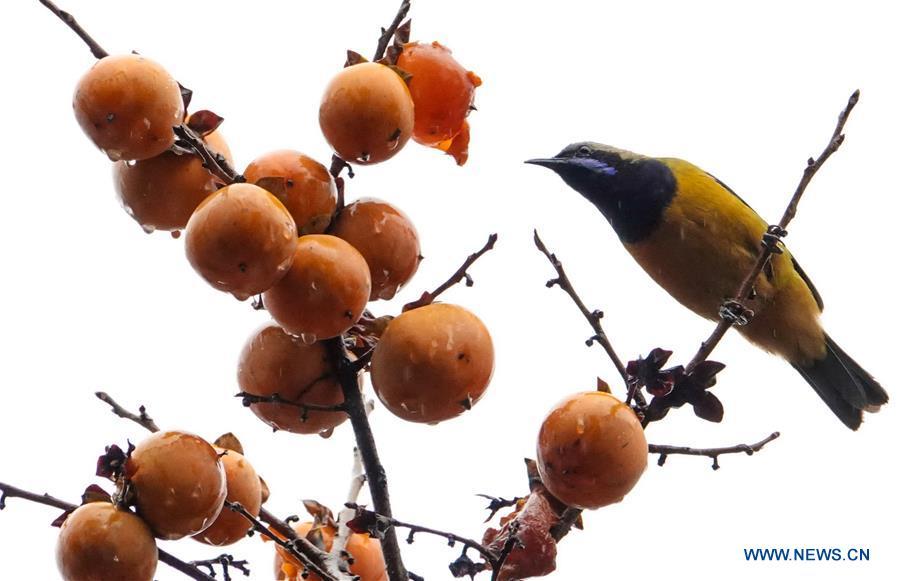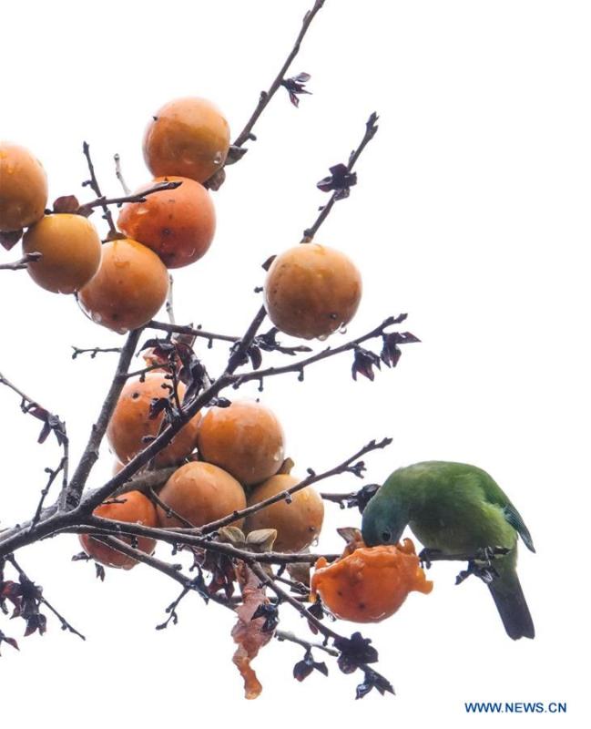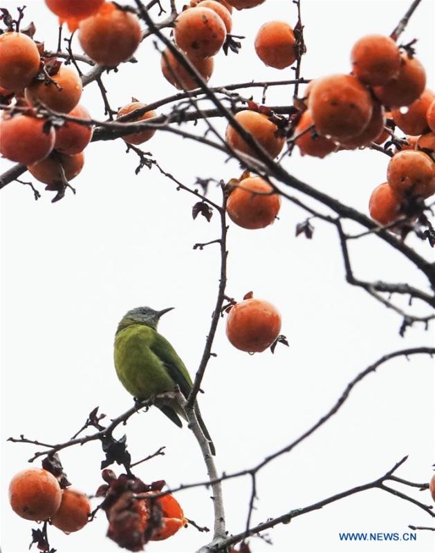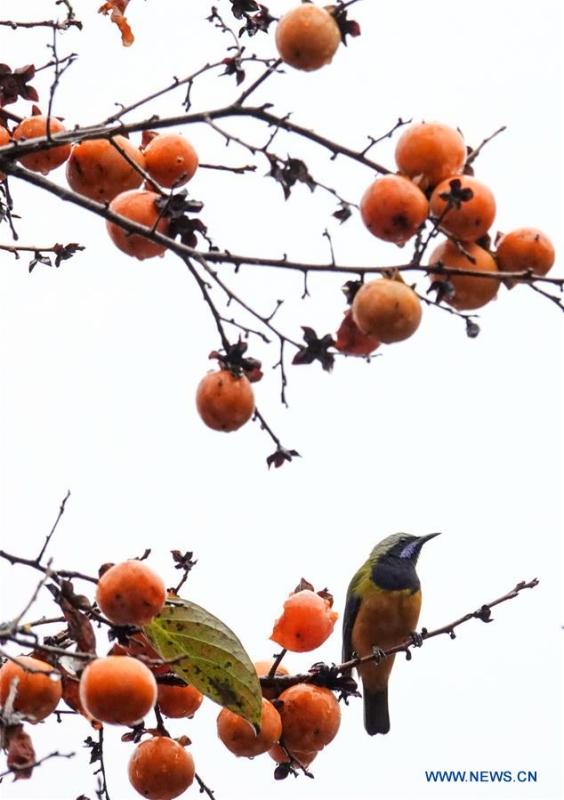 A bird eats a persimmon on a tree at Guizhou arboretum in Guiyang, southwest China's Guizhou Province, on Nov. 7, 2018. (Xinhua/Qiao Qiming)