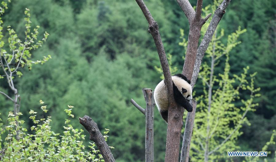 Photo taken on April 25, 2018 shows a giant panda at the Shenshuping base of China Conservation and Research Center for Giant Pandas in Wolong, southwest China's Sichuan Province. The number of captive pandas had reached 548 globally as of November this year, said China's National Forestry and Grassland Administration Thursday. A total of 48 pandas were born, and 45 survived this year in China, a survival rate of 93.75 percent, according to data released by the administration at the on-going International Conference for the Giant Panda Conservation and Breeding held in Chengdu. (Xinhua/Xue Yubin)
