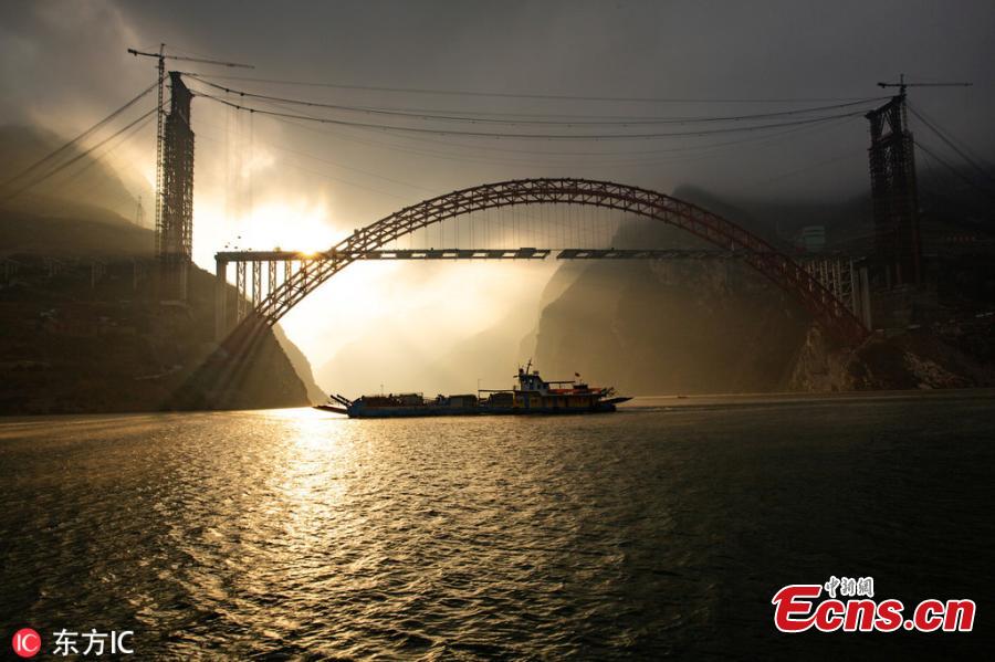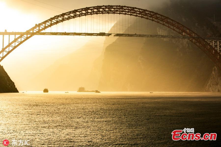 Sunrise at the construction site of a bridge over the Yangtze River in Zigui County, Central China's Hubei Province. The confluence of Xiangxi Stream, a tributary of China's greatest river, and Xiling Gorge, one of the Three Gorges, is a tourist attraction renowned for its magnificent scenic beauty. (Photo/IC)