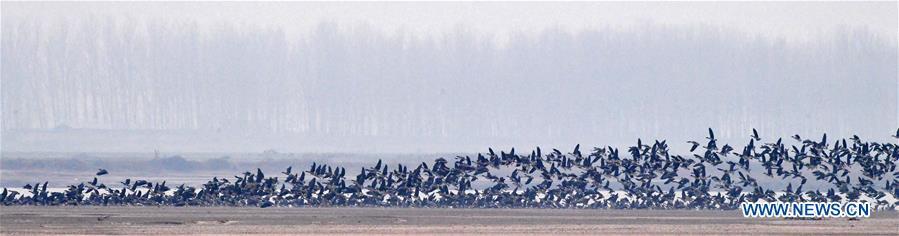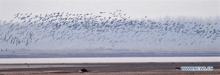 A group of wild geese fly over Yellow River Wetland in Changyuan County, central China's Henan Province, Dec. 25, 2018. (Xinhua/Feng Dapeng)
