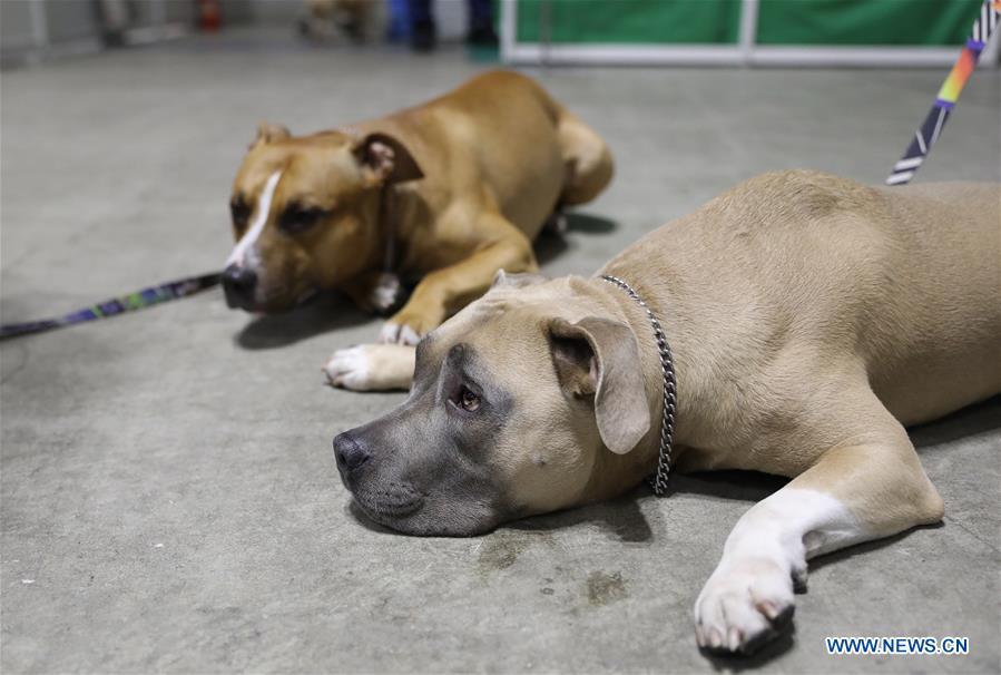 Pet dogs are seen at "Pet Haku 2019" in Yokohama, Japan, on Jan. 13, 2019. "Pet Haku", a pets and pet goods exhibition, is open to citizens with their pets. (Xinhua/Du Xiaoyi)