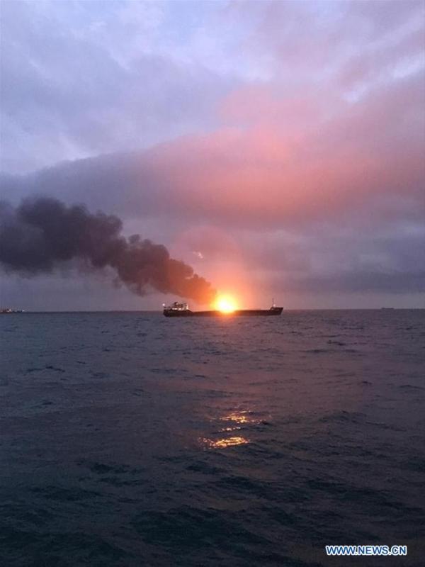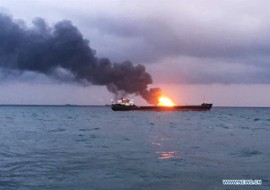 Photo taken on Jan. 21, 2019 shows a burning ship in the Kerch Strait. Two ships caught fire after a possible explosion while moving through the Kerch Strait, killing one sailor on board, Russia's Federal Agency of Maritime and River Transport (Rosmorrechflot) said Monday. (Xinhua/Sputnik)
