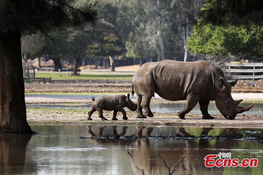 A white rhinoceros, named Karen Peles, walks together with her second calf, a 3-week old female, at the Safari Zoo, in Ramat Gan, Israel, Jan. 21, 2019. (Photo/Agencies)