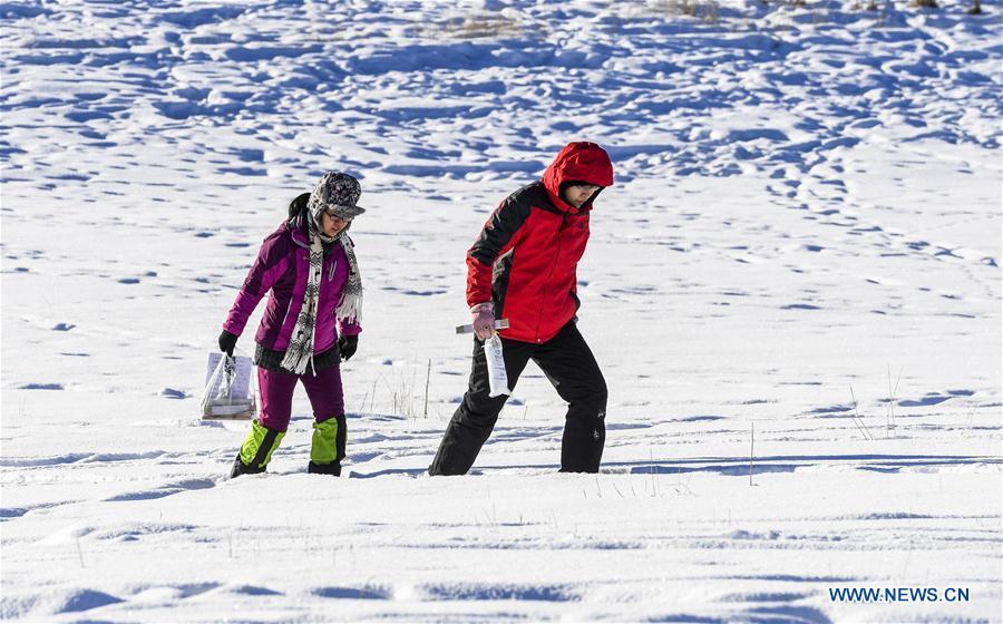 Researchers collect data of snow cover in Sa'erwuzike Village in Kaxajar township of Zhaosu County, northwest China's Xinjiang Uygur Autonomous Region, Jan. 18, 2019. A nine-member research team with an average age under 30 from the Xinjiang Institute of Ecology and Geography under the Chinese Academy of Sciences started a research on snow cover on the Tianshan Mountains in Xinjiang. Snow cover on the Tianshan Mountains is an important source of water resources. Snowmelt provides an abundant water supply for river flow in this area and also affects the ecological system of agricultural and animal husbandry production in the downstream oasis. (Xinhua/Hu Huhu)