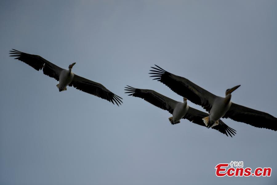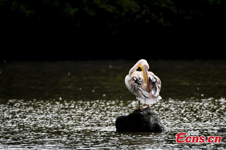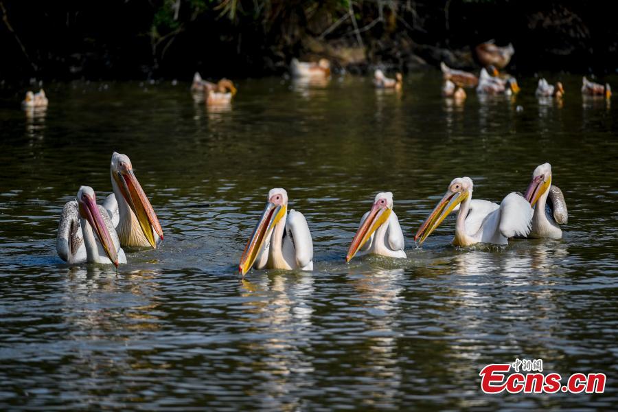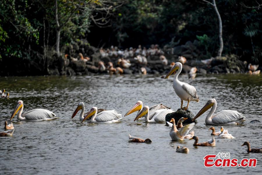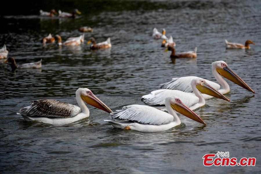 A number of great white pelican have been spotted in a village pond in Haikou City, Hainan Province, Jan. 24, 2019. The bird is a species under second class animal protection in China. (Photo/China News Service)