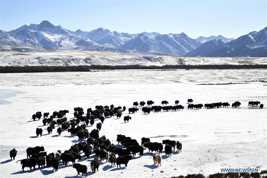 A herd of yaks are seen grazing on the snow-covered grassland at the Shandan Ranch with the Qilian Mountains in the background in Shandan County of Zhangye City, northwest China's Gansu Province, Jan. 23, 2019. (Xinhua/Li Xiao)