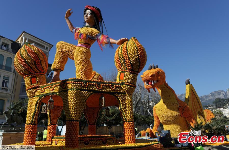 A sculpture made with lemons and oranges which depicts Scheherazade is seen during the 86th Lemon festival around the theme "Fantastic worlds" in Menton, France, Feb. 14, 2019. Since its start in 1933 as a fruit show, the festival on the French Riviera has grown into an internationally renowned event. (Photo/Agencies)