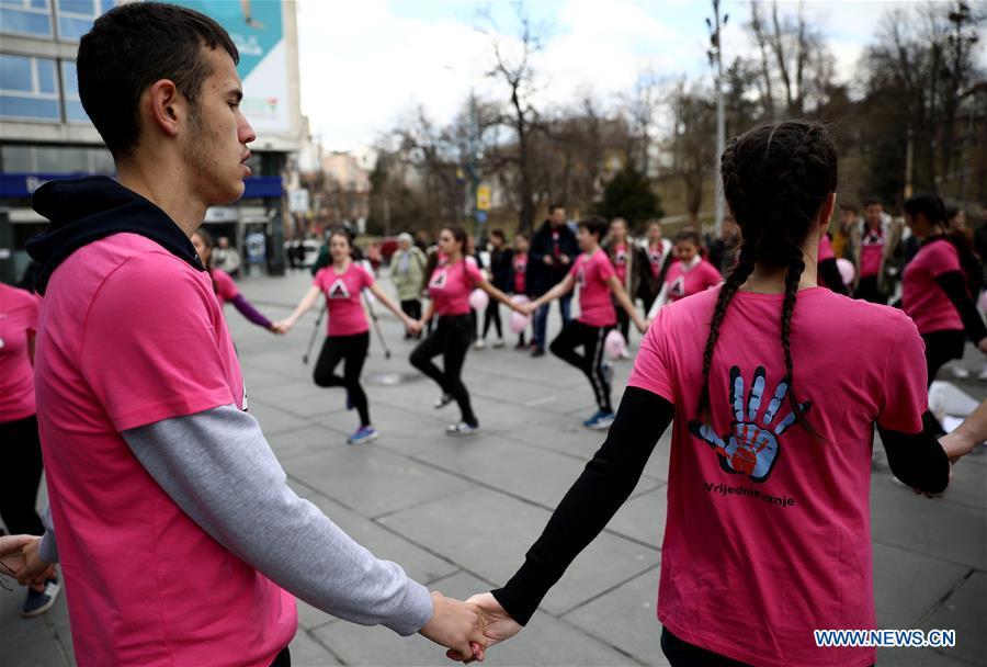 Dancers dressed in pink shirts perform a traditional dance during the Pink Shirt Day event calling for the prevention of peer violence, in Sarajevo, Bosnia and Herzegovina (BiH), on Feb. 27, 2019. The event held in the city center of Sarajevo on Wednesday attracted several hundred residents, who were informed about how to recognize the peer violence, and how to prevent it through conversation and quality time spending with a child who suffered some form of violence. (Xinhua/Nedim Grabovica)