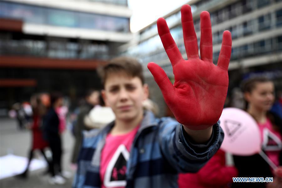 A boy shows his hand covered with red color that represents attitude towards peer violence during the Pink Shirt Day event calling for the prevention of peer violence, in Sarajevo, Bosnia and Herzegovina (BiH), on Feb. 27, 2019. The event held in the city center of Sarajevo on Wednesday attracted several hundred residents, who were informed about how to recognize the peer violence, and how to prevent it through conversation and quality time spending with a child who suffered some form of violence. (Xinhua/Nedim Grabovica)
