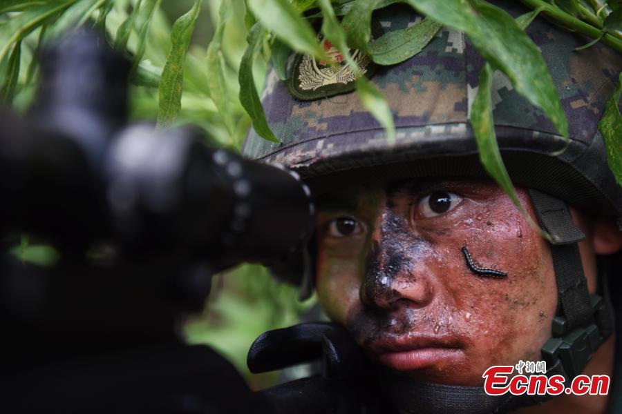Wu Jia, a sniper with the armed police, remains still despite having an insect craw over his face during a training at an open field in Anhui Province, June 25, 2019. (Photo: China News Service/Xu Wei)