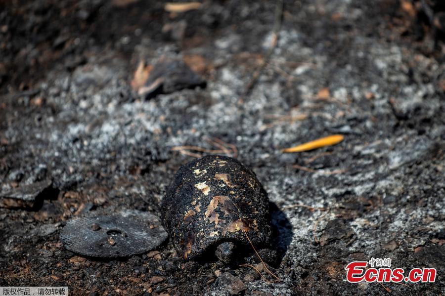 A photo shows a burnt turtle following a wildfire on Mount Hymittos in the suburb of Peania near Athens on August 12, 2019. Greek firefighters on August 12, 2019 brought under control a major forest fire that was threatening homes on the outskirts of Athens, officials said. At least two houses were burned but there were no reports of injuries as police quickly evacuated the area and blocked roads. (Photo/Agencies)