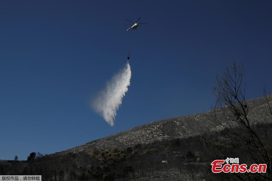 A firefighting helicopter makes a water drop during a wildfire on Mount Hymettus, near Athens, Greece, August 12, 2019. (Photo/Agencies)