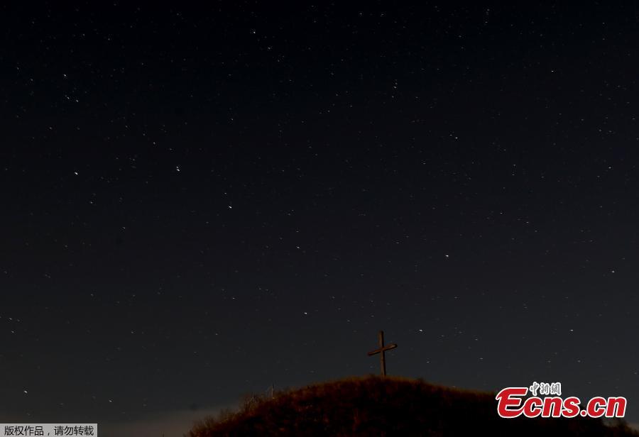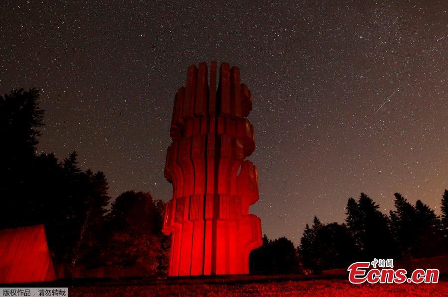 A meteor streaks across the sky near the Monument to the Revolution at Kozara during the peak of the Perseid meteor shower in Prijedor, Bosnia and Herzegovina, Aug. 12, 2019.(Photo/Agencies)