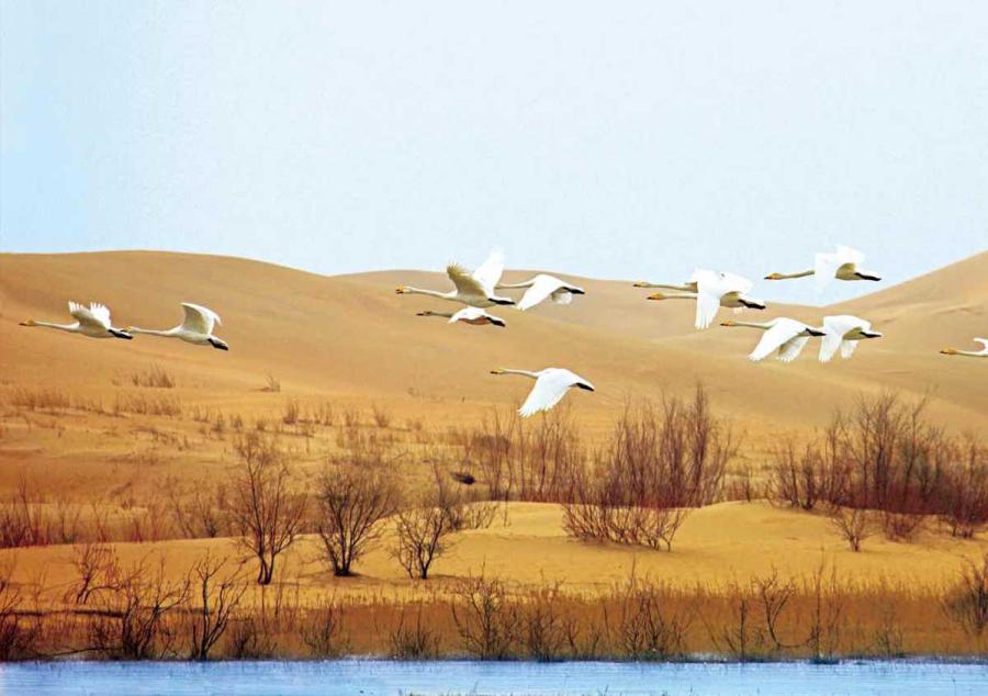 Over a thousand birds live in or around the Kubuqi Desert in North China's Inner Mongolia autonomous region. (Photo provided to chinadaily.com.cn)