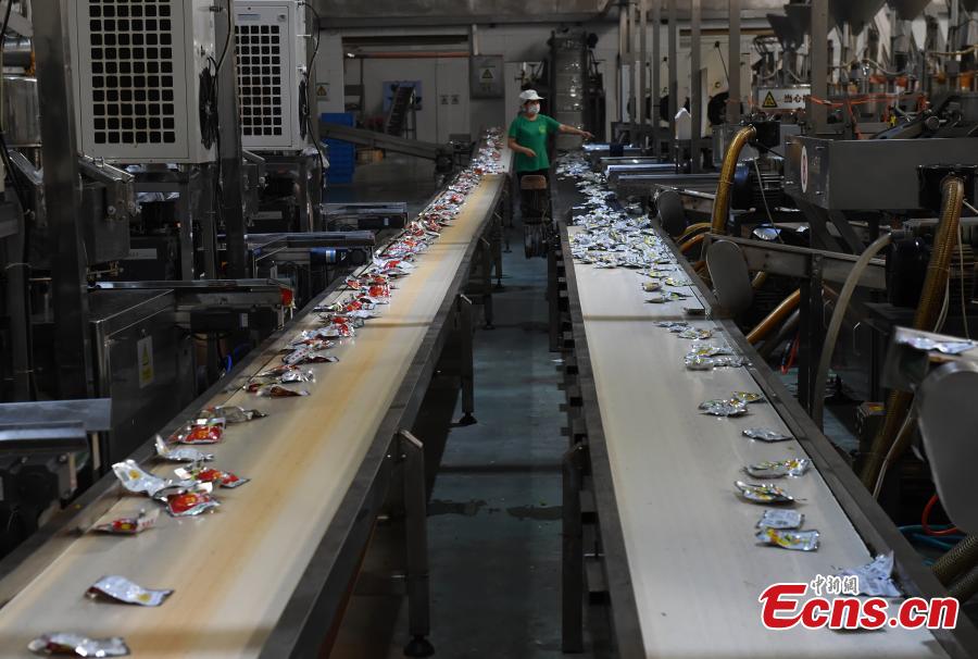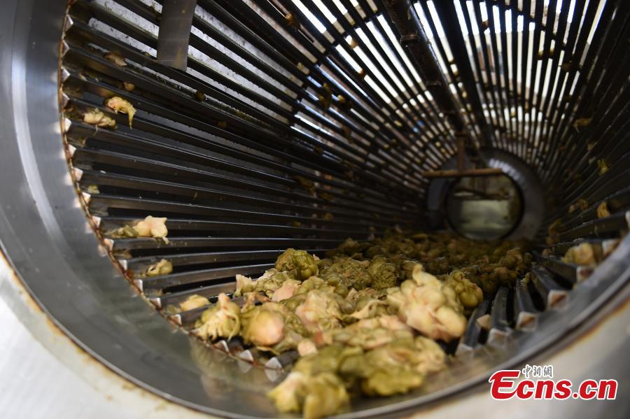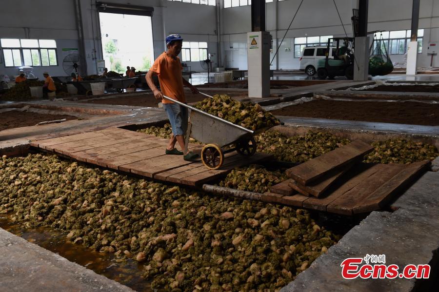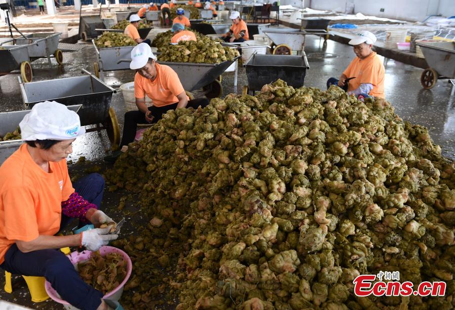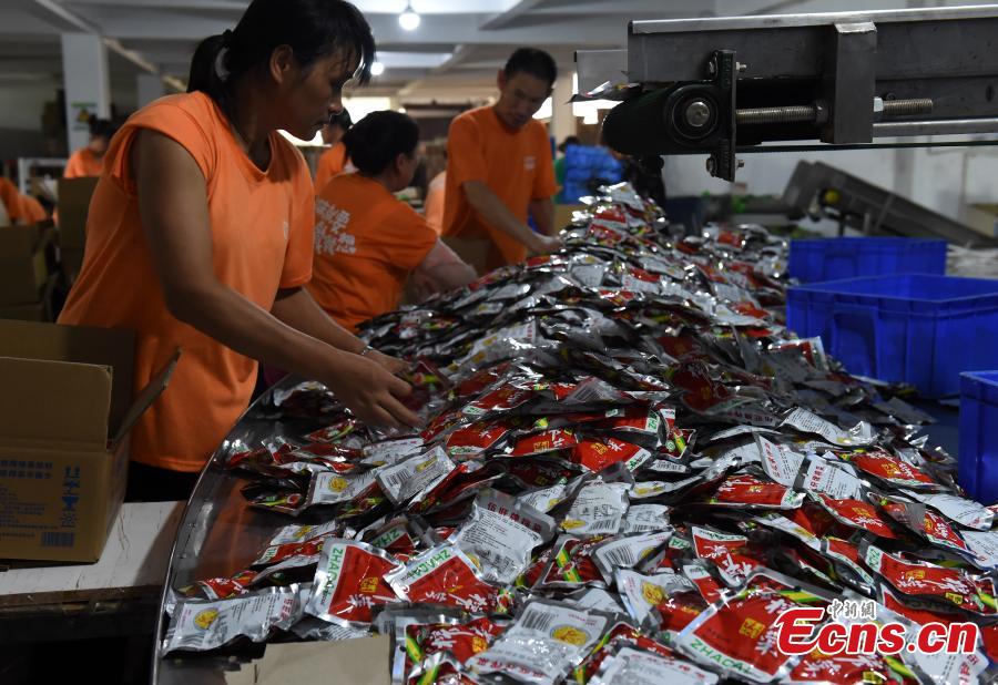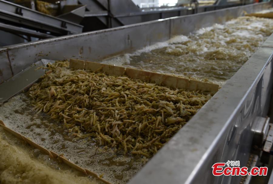 A view of the production of zhacai preserved pickles at a company in Fuling District, southwest China's Chongqing Municipality. Fuling zhacai ranks as one of the world’s three most famous pickled dishes along with sauerkraut from German and pickled cucumbers from France. More than 600,000 farmers in Fuling are involved in planting stem mustard, the raw material for the pickle, according to a Xinhua report in February. (Photo: China News Service/Zhou Yi)