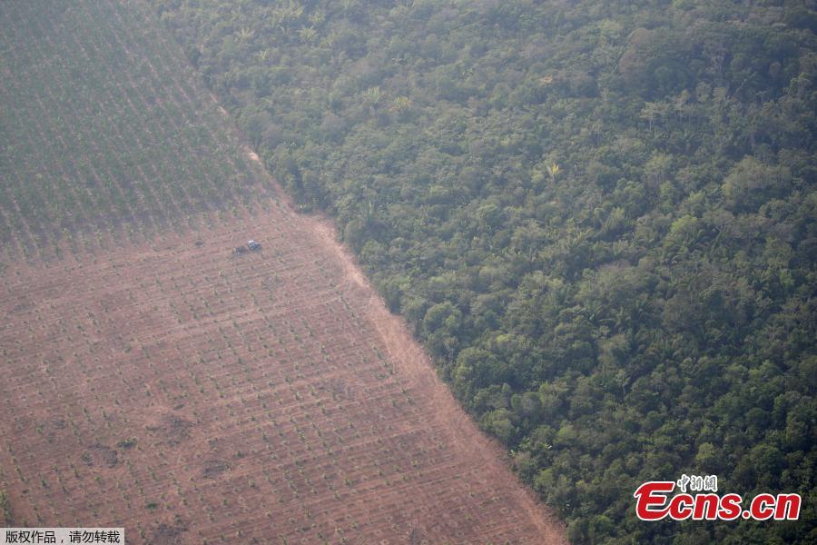 An aerial view shows a tractor on a plantation near a deforested plot of the Amazon near Porto Velho, Rondonia State, Brazil August 22, 2019. (Photo/Agencies)