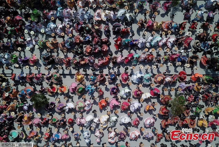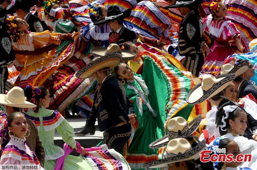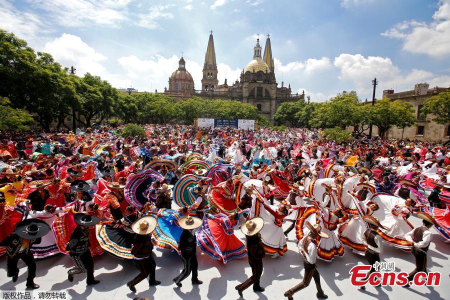 People dance to Mariachi traditional music to break the Guinness World Record of largest Mexican folk dance in Guadalajara, Jalisco state, Mexico, on August 24, 2019. 882 people danced to Mariachi music at the start of the 26th Mariachi International Festival. (Photo/Agencies)