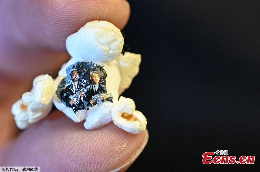 Photo shows two armed men in black painted on a popcorn by Turkey's micro artist Hasan Kale in Istanbul. August 23, 2019. (Photo/Agencies)