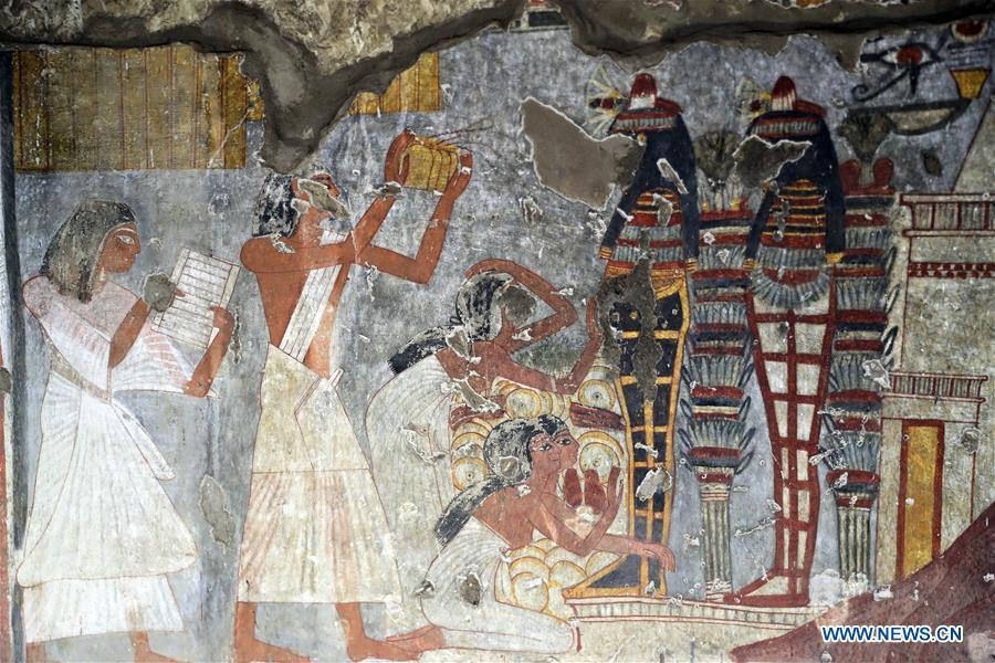 Photo taken on Sept. 8, 2019 shows drawings in the Theban Tomb 286 in Luxor, Egypt. The Egyptian Ministry of Antiquities announced on Sunday the opening of two ancient Egyptian tombs for visitors after their restoration on the Nile River's west bank of Upper Egypt's monument-rich province of Luxor. (Xinhua/Ahmed Gomaa)