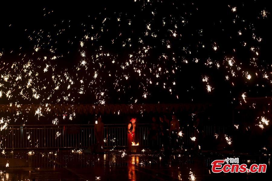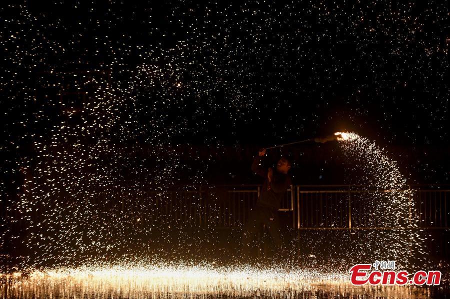 A shower of molten iron sparks like fireworks during a performance at a lantern festival in Changsha, Central China’s Hunan Province, December 24, 2019. With a history of over 1,000 years, the classic molten iron sparks show was recognized as national-level intangible cultural heritage in 2008. (Photo: China News Service/ Yang Huafeng)