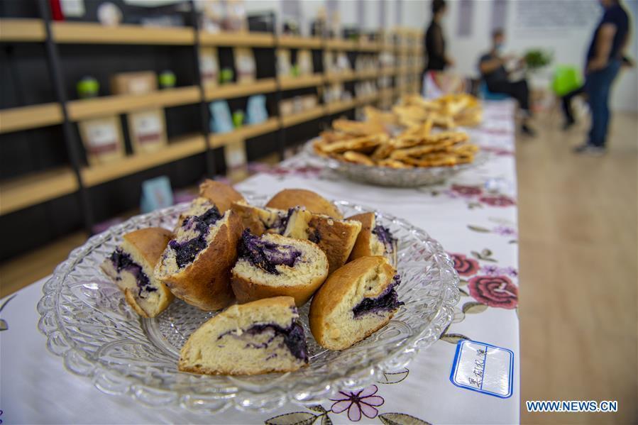 Photo taken on July 13, 2020 shows products of nang, a kind of flatbread, baked with goji berries at an industry demonstration base in Jinghe County, northwest China's Xinjiang Uygur Autonomous Region. As over 100,000 mu (about 6,667 hectares) of goji berries in the county are ripening in Jinghe County, farmers have been busy with the harvesting work here these days. Thanks to dry weather, adequate sunshine, and a large temperature difference between day and night, Jinghe County becomes a place suitable for growing the high-quality goji berries. To help increase the income of local farmers, local authorities have stepped up financial support to develop goji berry industrial chain and meanwhile made great effort to promote their products. (Xinhua/Hu Huhu)