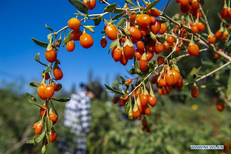 Photo taken on July 13, 2020 shows ripe goji berries in Jinghe County, northwest China's Xinjiang Uygur Autonomous Region. As over 100,000 mu (about 6,667 hectares) of goji berries in the county are ripening in Jinghe County, farmers have been busy with the harvesting work here these days. Thanks to dry weather, adequate sunshine, and a large temperature difference between day and night, Jinghe County becomes a place suitable for growing the high-quality goji berries. To help increase the income of local farmers, local authorities have stepped up financial support to develop goji berry industrial chain and meanwhile made great effort to promote their products. (Xinhua/Hu Huhu)