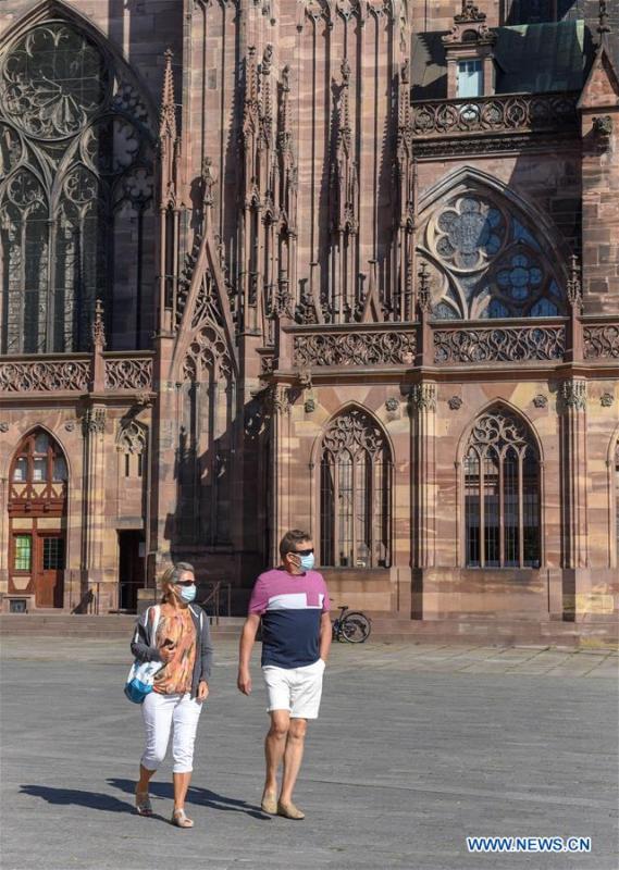 People wearing face masks are seen in central Strasbourg, eastern France, on Aug. 5, 2020. The French authorities have ordered people to wear face masks in outdoor public places in many major cities as the COVID-19 spread faster and the admission to intensive care units increased again after month-long decline. (Photo by Genevieve Engel/Xinhua)