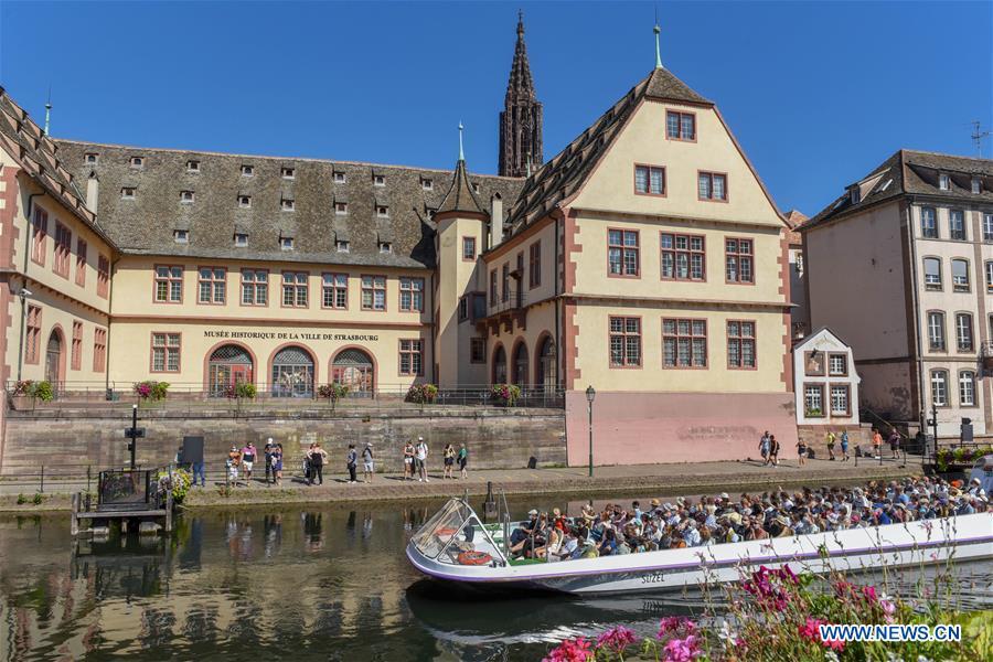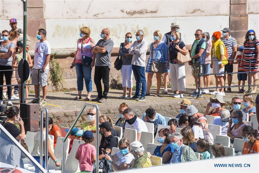 People wearing face masks take a tourist cruise in central Strasbourg, eastern France, on Aug. 5, 2020. The French authorities have ordered people to wear face masks in outdoor public places in many major cities as the COVID-19 spread faster and the admission to intensive care units increased again after month-long decline. (Photo by Genevieve Engel/Xinhua)
